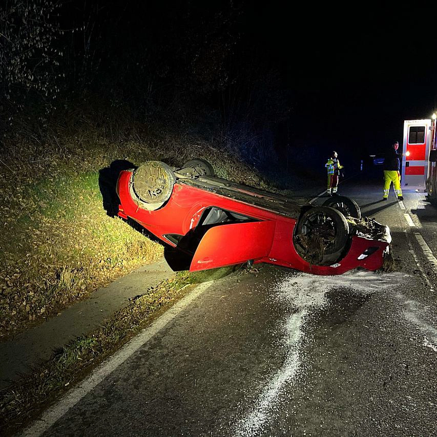 Ein 18-jähriger Fahrer aus Kürten überholte dort nach ersten Erkenntnissen der Polizei außerhalb einer Ortschaft kurz vor einer Kurve einen anderen Pkw. In der Kurve geriet sein Toyota ins Schleudern, kam von der Fahrbahn ab und überschlug sich. Der Wagen blieb auf dem Dach liegen. Als mögliche Unfallursache nennt die Polizei nicht angepasste Geschwindigkeit bei winterlicher Glätte.