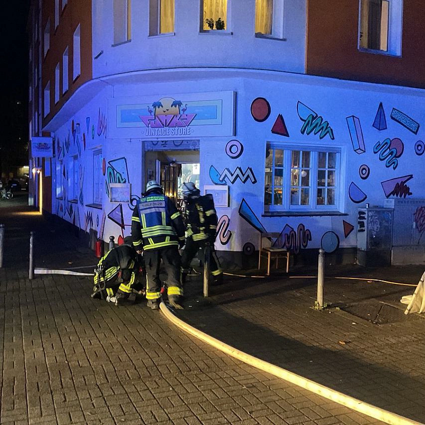Die Einsatzkräfte wurden umgehend alarmiert. Vor Ort berichteten die Inhaber des Vintage-Geschäfts in der Kirchenstraße, dass sie den Brand bereits mit einem Feuerlöscher unter Kontrolle gebracht hatten. Da jedoch noch Brandrauch austrat, rückte ein Trupp der Feuerwehr mit Atemschutz zur Überprüfung und für Nachlöscharbeiten vor. Zur Entrauchung des Bereichs kam ein Lüfter zum Einsatz.