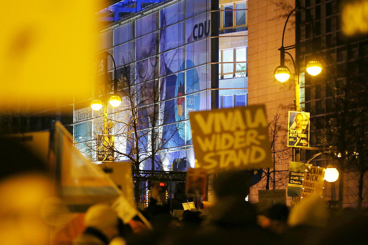 Man dürfe es sich aber nicht zu leicht machen, indem man sich auf die CDU stürze. Es sei die AfD, die das Land vor sich hertreibe. Musikalisch traten unter anderem Nina Chuba und die Sängerin Mine auf. Von der Reichstagswiese zogen die Protestler nach der Auftaktkundgebung weiter zum Konrad-Adenauer-Haus.